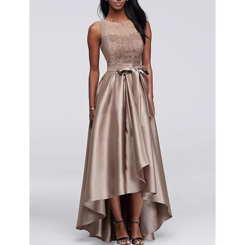 A-Line Mother of the Bride Dress Wedding Guest Elegant High Low Jewel Neck Asymmetrical Satin Sleeveless with Bow(s)