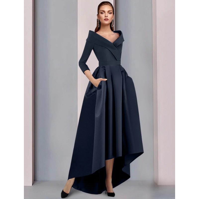 A-Line Mother of the Bride Dress Wedding Guest Elegant High Low Sweet Spaghetti Strap Asymmetrical Tea Length Satin 3/4 Length Sleeve with Pleats Fall