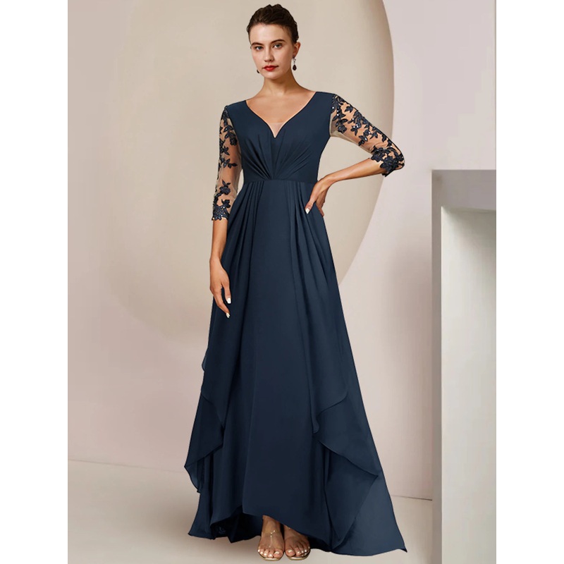A-Line Mother of the Bride Dress Wedding Guest Elegant High Low V Neck Ankle Length Chiffon Lace 3/4 Length Sleeve with Sequin Appliques 2