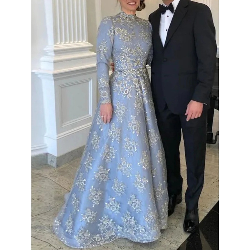 A-Line Mother of the Bride Dress Wedding Guest Elegant Party Luxurious High Neck Floor Length Lace Tulle Sequined Long Sleeve with Lace Sequin