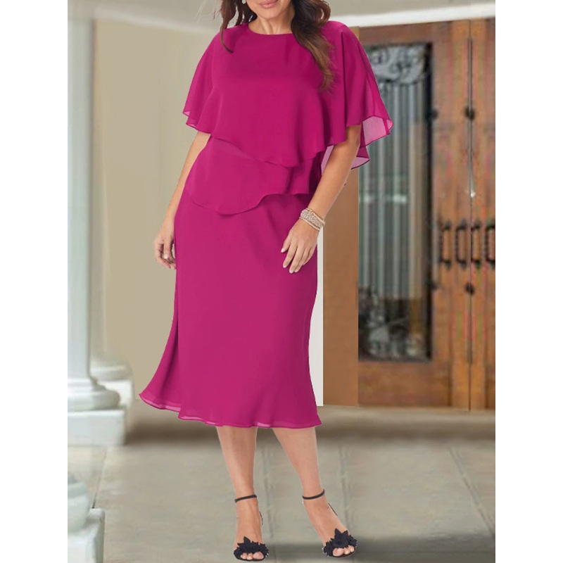 A-Line Mother of the Bride Dress Wedding Guest Elegant Plus Size Jewel Neck Tea Length Chiffon Short Sleeve with Ruffles
