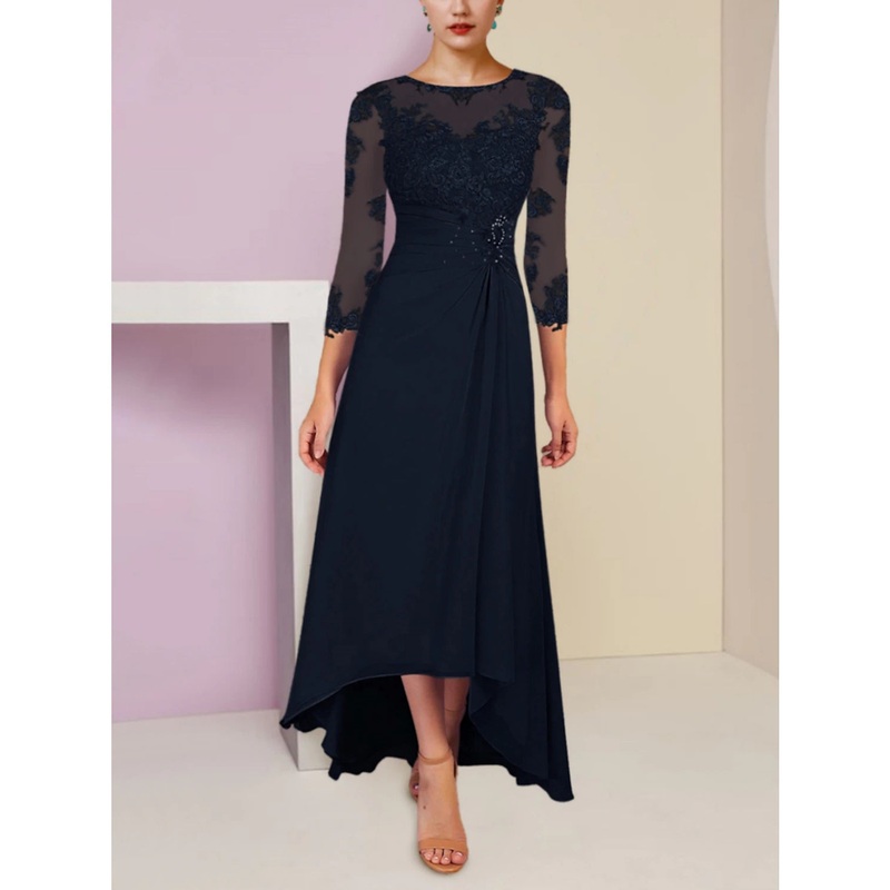 A-Line Mother of the Bride Dress Wedding Guest Elegant Scoop Neck Asymmetrical Ankle Length Chiffon 3/4 Length Sleeve with Lace Sequin Ruching