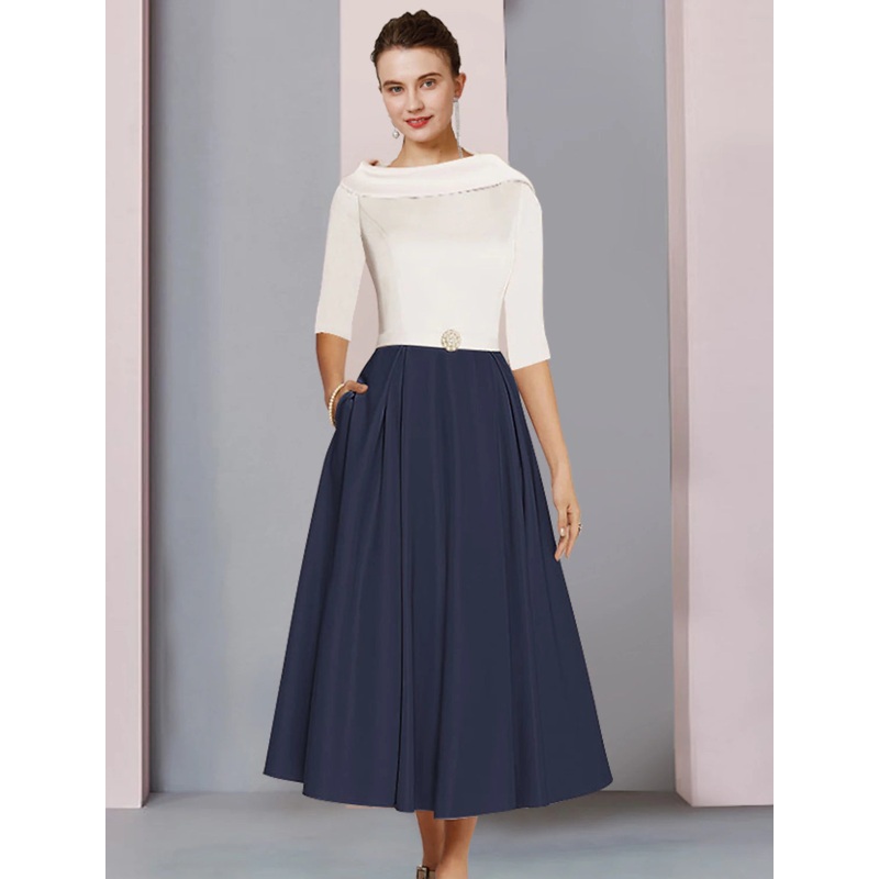 A-Line Mother of the Bride Dress Wedding Guest Elegant Scoop Neck Tea Length Satin Half Sleeve with Pleats Crystal Brooch Color Block