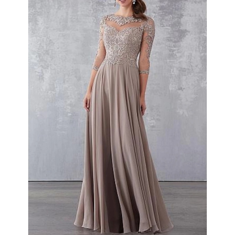 A-Line Mother of the Bride Dress Wedding Guest Elegant See Through Jewel Neck Floor Length Chiffon Lace 3/4 Length Sleeve with Draping Appliques