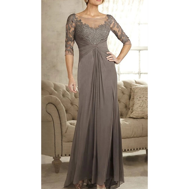 A-Line Mother of the Bride Dress Wedding Guest Elegant Simple Jewel Neck Floor Length Chiffon Lace 3/4 Length Sleeve with Crystals Appliques