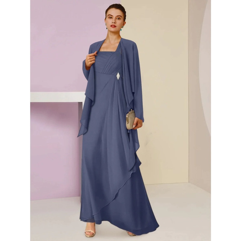 A-Line Mother of the Bride Dress Wedding Guest Elegant Square Neck Ankle Length Chiffon Long Sleeve with Crystal Brooch Ruching