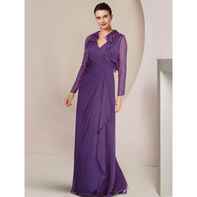 A-Line Mother of the Bride Dress Wedding Guest Elegant V Neck Floor Length Chiffon Long Sleeve with Ruffles Ruching