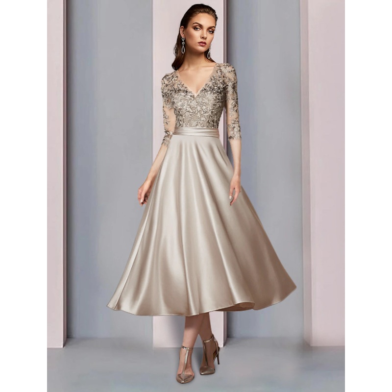A-Line Mother of the Bride Dress Wedding Guest Elegant V Neck Tea Length Satin Lace Half Sleeve with Pleats Appliques
