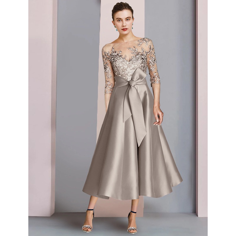 A-Line Mother of the Bride Dress Wedding Guest Party Elegant Scoop Neck Tea Length Satin Lace Half Sleeve with Bow(s) Appliques