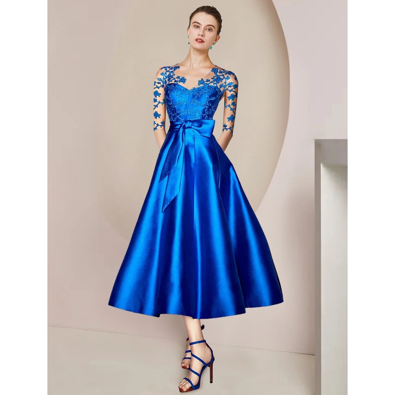A-Line Mother of the Bride Dress Wedding Guest Party Elegant V Neck Tea Length Satin Lace Half Sleeve with Bow(s) Pleats Appliques