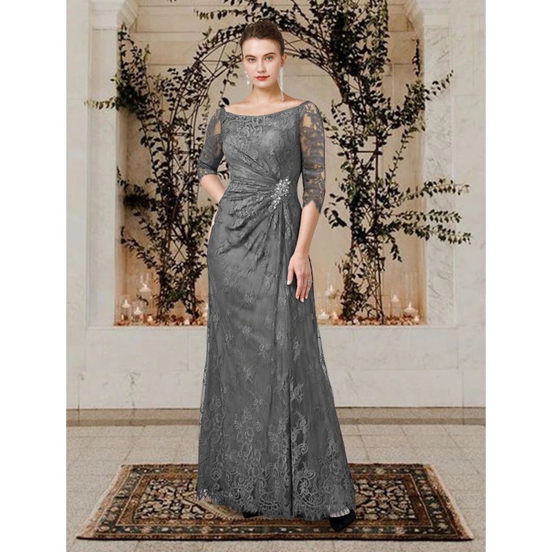 A-Line Mother of the Bride Dress Wedding Guest Plus Size Elegant Jewel Neck Floor Length Lace Short Sleeve with Ruffles Crystal Brooch Side-Draped Fall