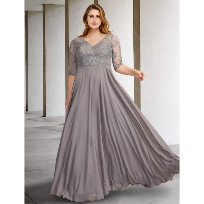 A-Line Mother of the Bride Dresses Plus Size Hide Belly Curve Elegant Dress Formal Floor Length Half Sleeve V Neck Chiffon with Pleats Sequin Appliques