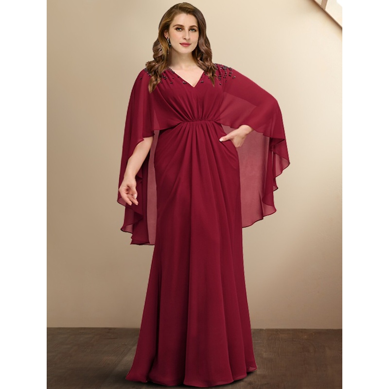 A-Line Mother of the Bride Dresses Plus Size Hide Belly Curve Elegant Dress Formal Floor Length Sleeveless V Neck Chiffon with Pleats Beading
