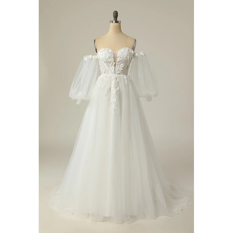 A Line Off Shoulder Ivory Long sleeved Wedding Dress