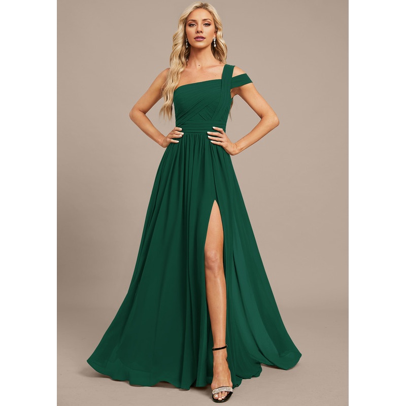 A-line off-the-shoulder one-shoulder floor-length chiffon pleated evening gown