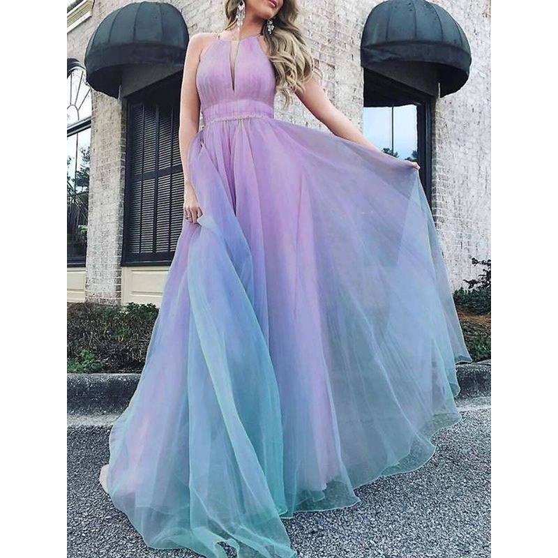 A-Line Ombre Fairy Prom Valentine's Day Dress Jewel Neck Sleeveless Floor Length Chiffon with Sleek Pleats