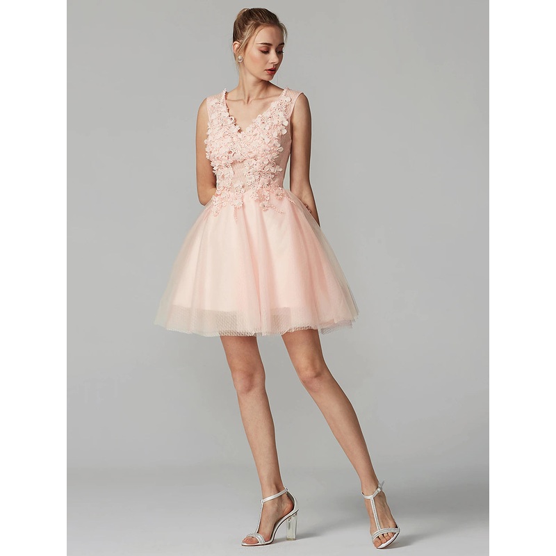 A-Line Party Dress Homecoming Graduation Short / Mini Sleeveless V Neck Lace Over Tulle with Crystals Appliques