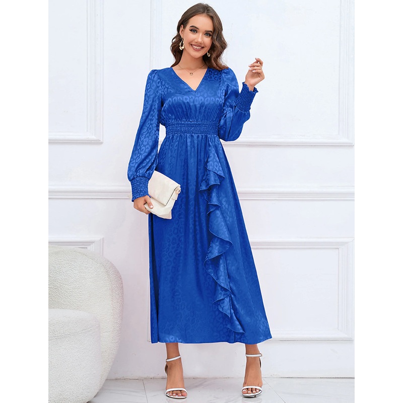 Be the first to review “A-Line Party Dresses Elegant Dress Formal Fall Ankle Length Long Sleeve V Neck Satin with Ruffles Print”