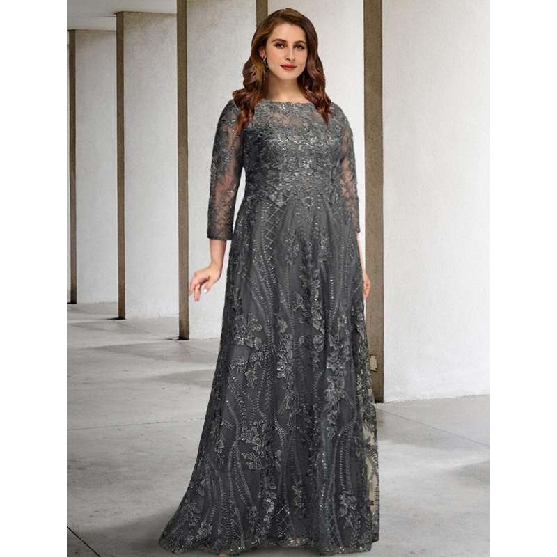 A-Line Plus Size Curve Mother of the Bride Dresses Elegant Dress Formal Wedding Guest Sweep / Brush Train Long Sleeve Jewel Neck Chiffon with Appliques