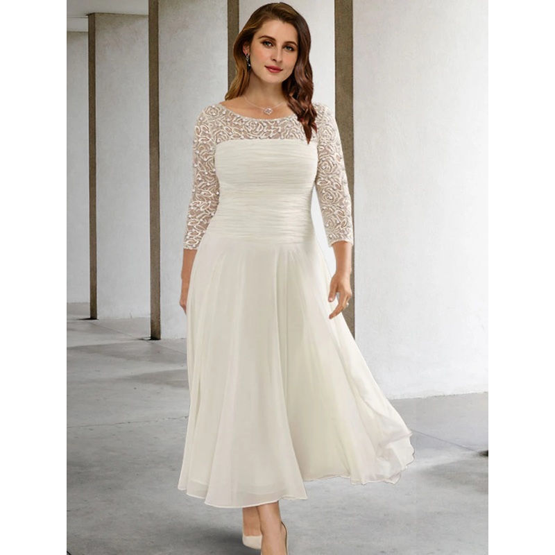 A-Line Plus Size Curve Mother of the Bride Dresses Elegant Dress Formal Wedding Guest Tea Length 3/4 Length Sleeve Jewel Neck Chiffon with Ruched Beading Sequin