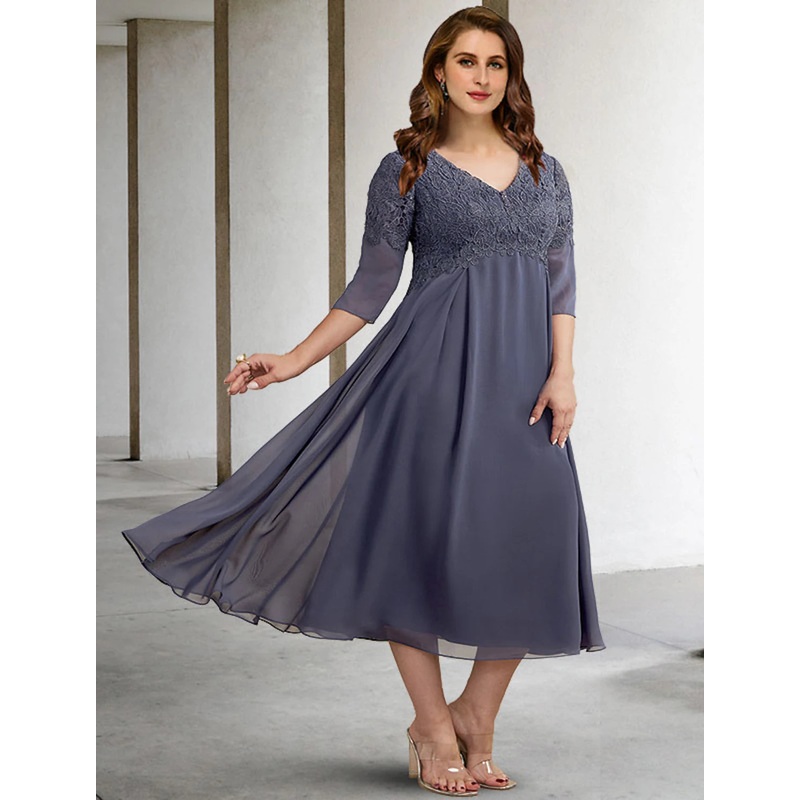 A-Line Plus Size Curve Mother of the Bride Dresses Elegant Dress Formal Wedding Guest Tea Length Half Sleeve V Neck Chiffon with Buttons Appliques