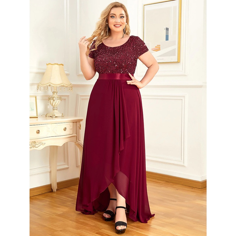 Be the first to review “A-Line Plus Size Elegant Homecoming Formal Evening Dress Jewel Neck Short Sleeve Asymmetrical Chiffon with Sequin”
