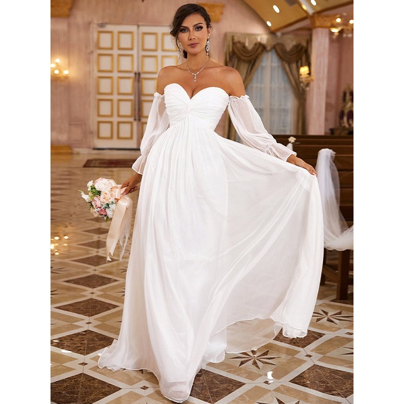 A-Line/Princess 30D Chiffon Ruched Off-the-Shoulder Long Sleeves Sweep/Brush Train Wedding Dresses