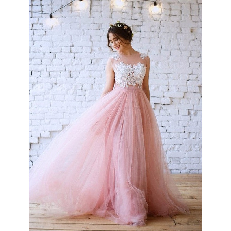 A-Line/Princess Applique Bateau Sleeveless Tulle Sweep/Brush Train Dresses