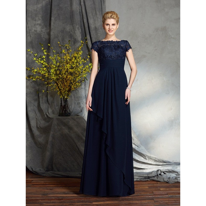 A-Line/Princess Bateau Applique Short Sleeves Long Chiffon Mother of the Bride Dresses