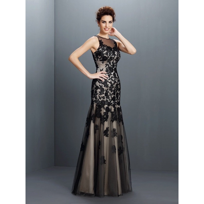 A-Line/Princess Bateau Applique Sleeveless Long Satin Dresses