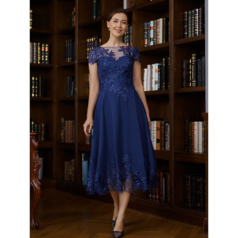 A-Line/Princess Chiffon Applique Bateau Short Sleeves Tea-Length Mother of the Bride Dresses