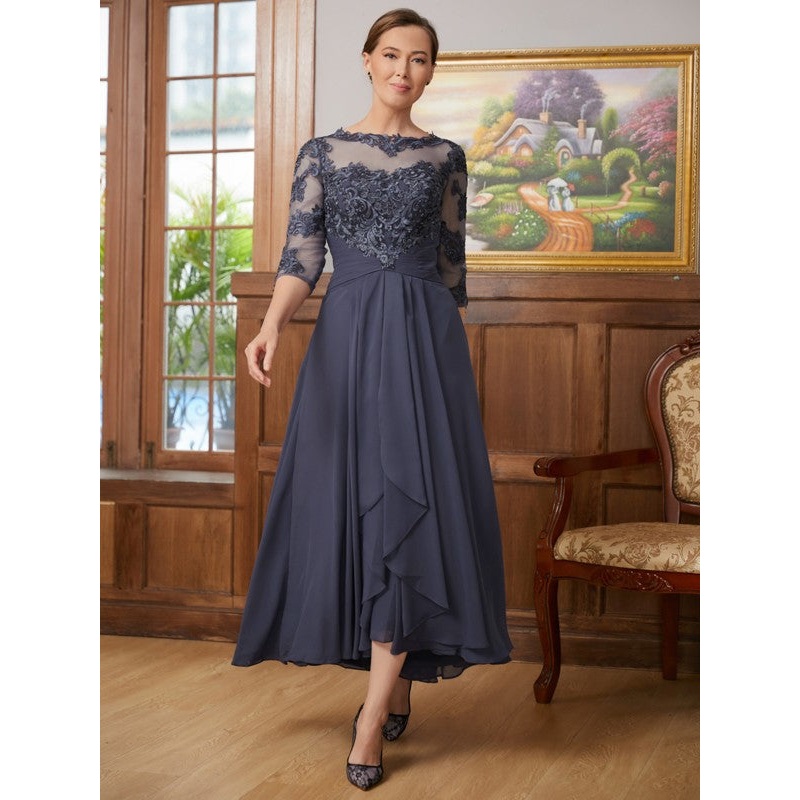 A-Line/Princess Chiffon Applique Scoop 3/4 Sleeves Asymmetrical Mother of the Bride Dresses