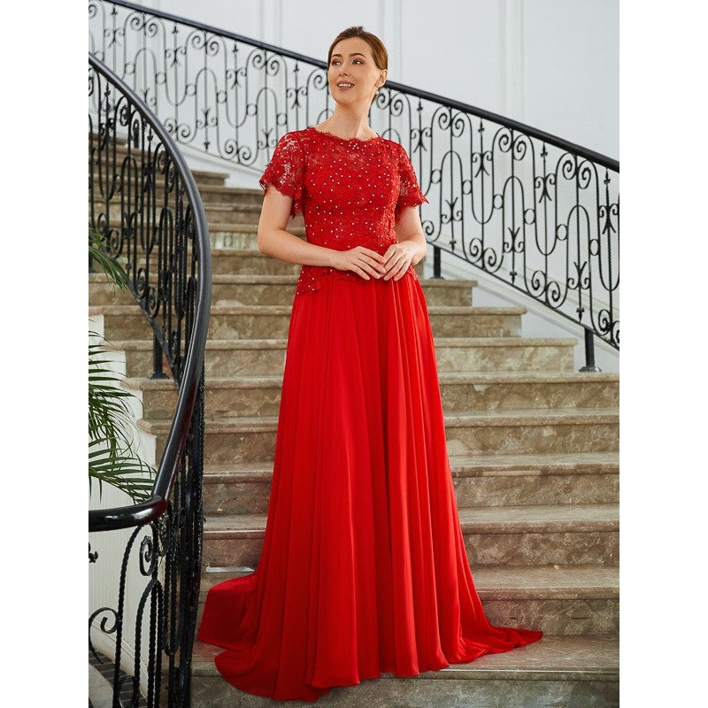 A-Line/Princess Chiffon Applique Scoop Short Sleeves Sweep/Brush Train Mother of the Bride Dresses