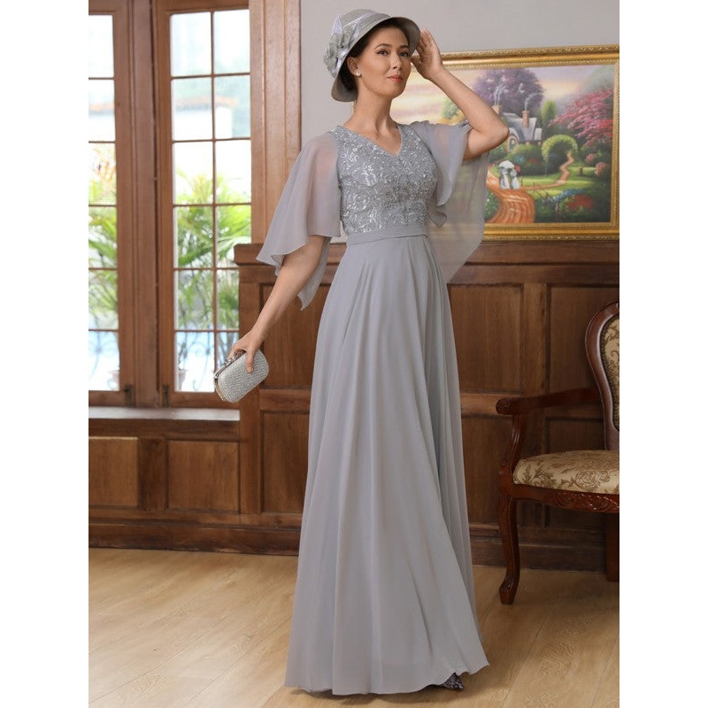 A-Line/Princess Chiffon Applique V-neck 1/2 Sleeves Floor-Length Mother of the Bride Dresses