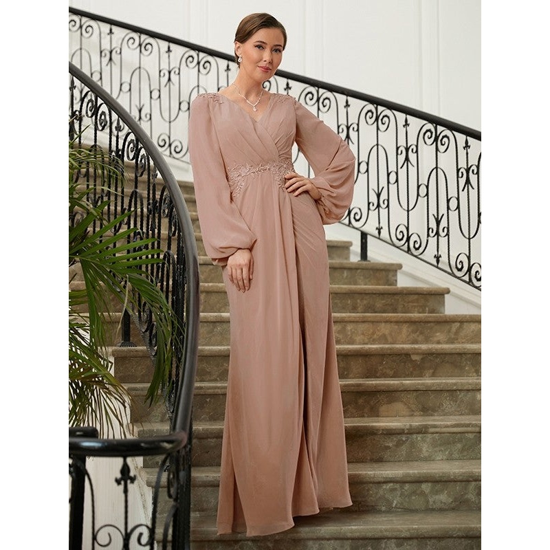 A-Line/Princess Chiffon Applique V-neck Long Sleeves Floor-Length Mother of the Bride Dresses