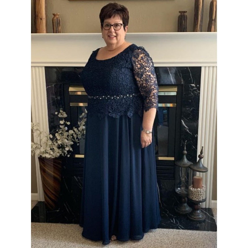 A-Line/Princess Chiffon Lace Scoop 3/4 Sleeves Floor-Length Plus Size Mother of the Bride Dresses