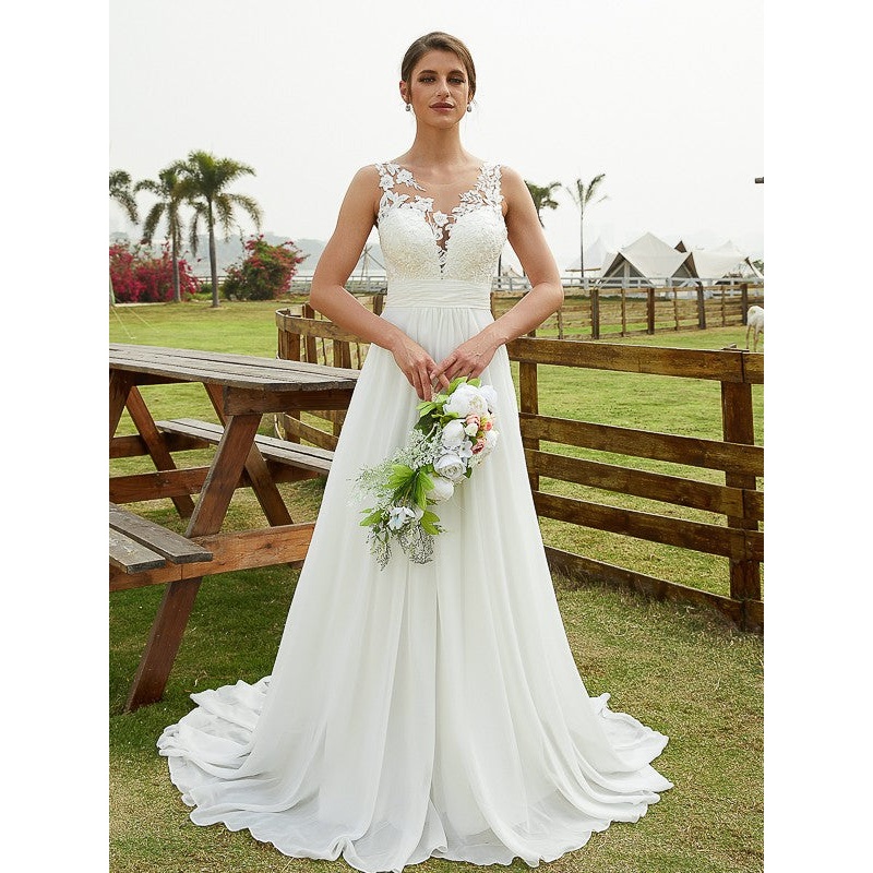 A-Line/Princess Chiffon Lace Scoop Sleeveless Sweep/Brush Train Wedding Dresses