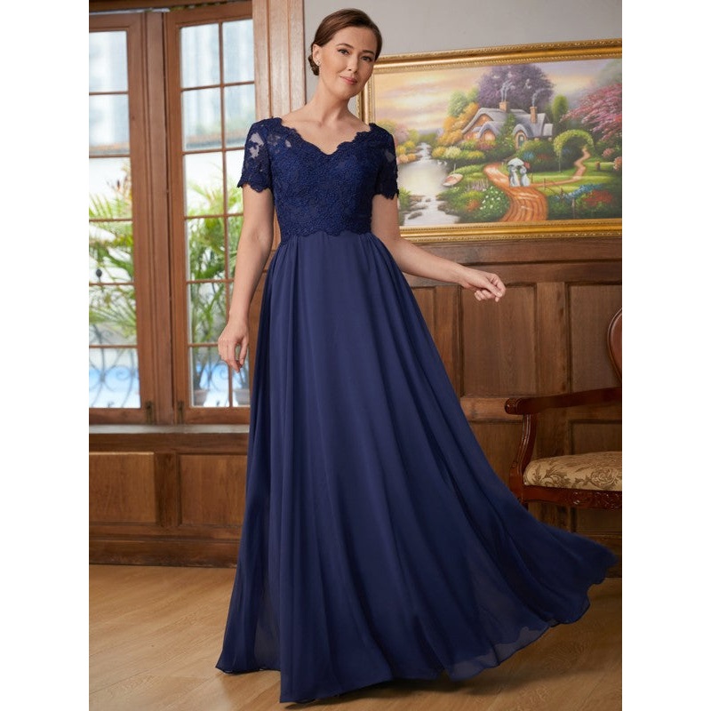 A-Line/Princess Chiffon Lace V-neck Short Sleeves Floor-Length Mother of the Bride Dresses