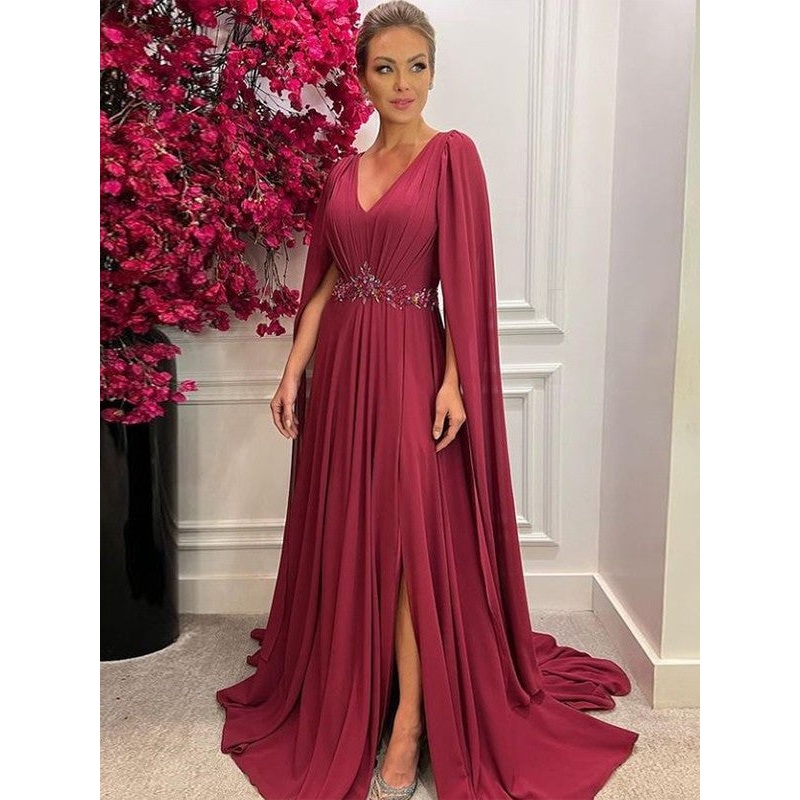 A-Line/Princess Chiffon Ruched V-neck Long Sleeves Court Train Mother of the Bride Dresses