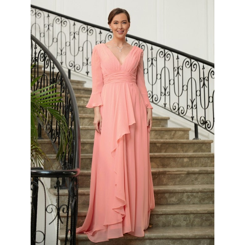 A-Line/Princess Chiffon Ruched V-neck Long Sleeves Sweep/Brush Train Mother of the Bride Dresses