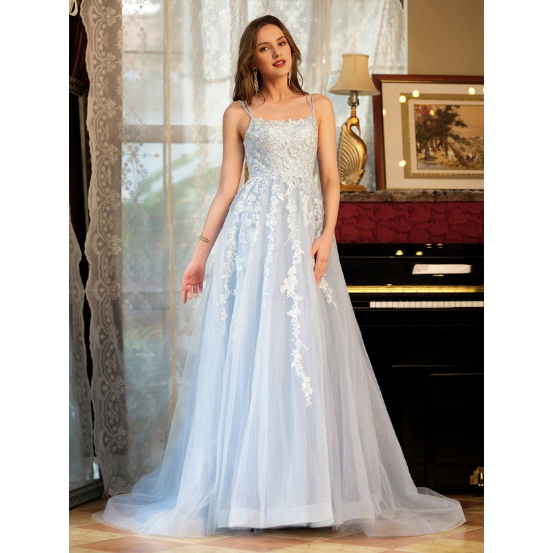 A-line princess chiffon thin shoulder strap embroidered long ball dress