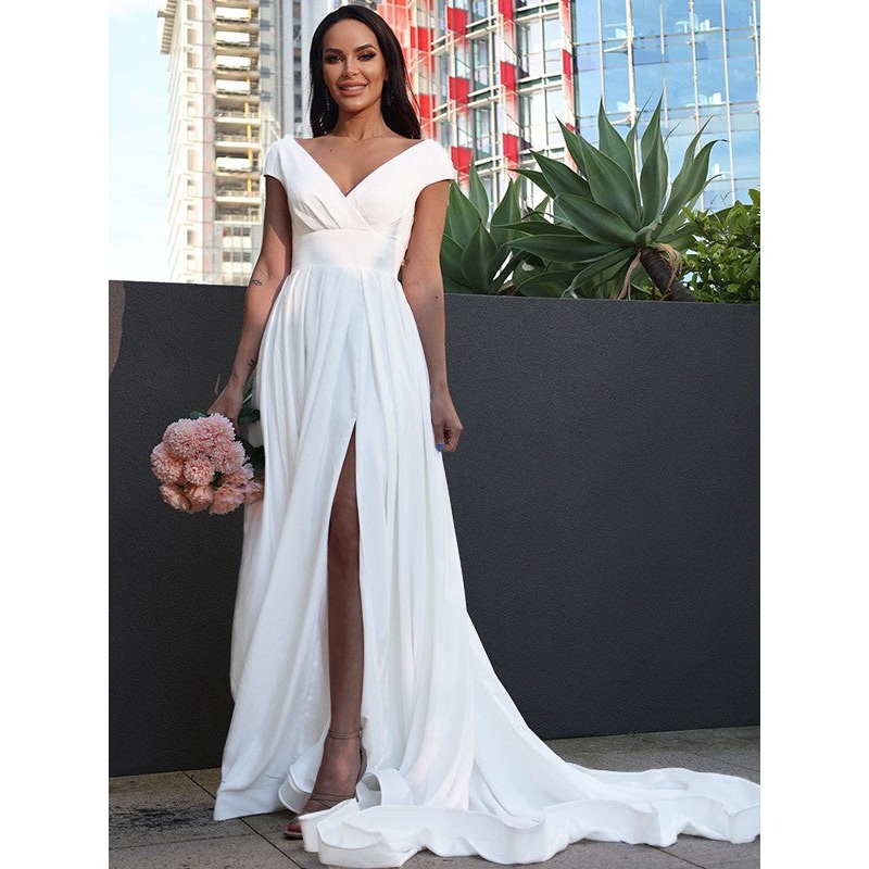 A-Line/Princess Crepe Ruffles V-neck Short Sleeves Sweep/Brush Train Wedding Dresses