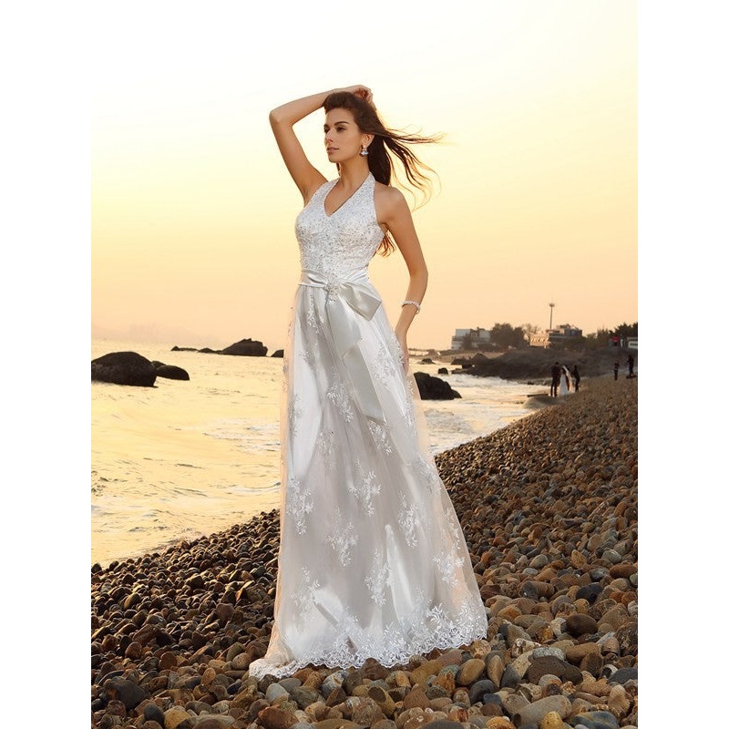 A-Line/Princess Halter Sash/Ribbon/Belt Sleeveless Long Lace Beach Wedding Dresses