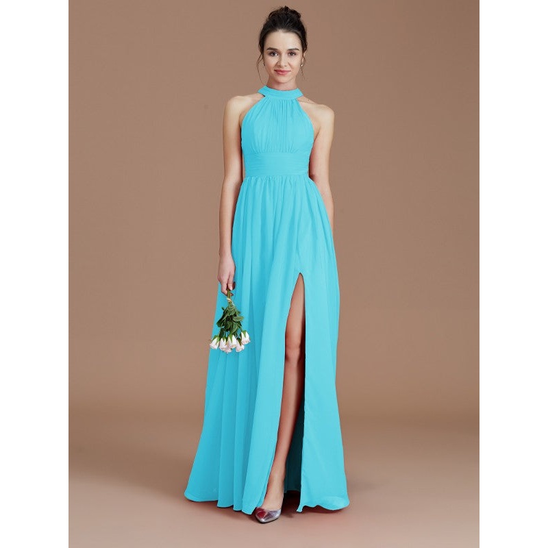 A-Line/Princess Halter Sleeveless Ruched Floor-Length Chiffon Bridesmaid Dresses