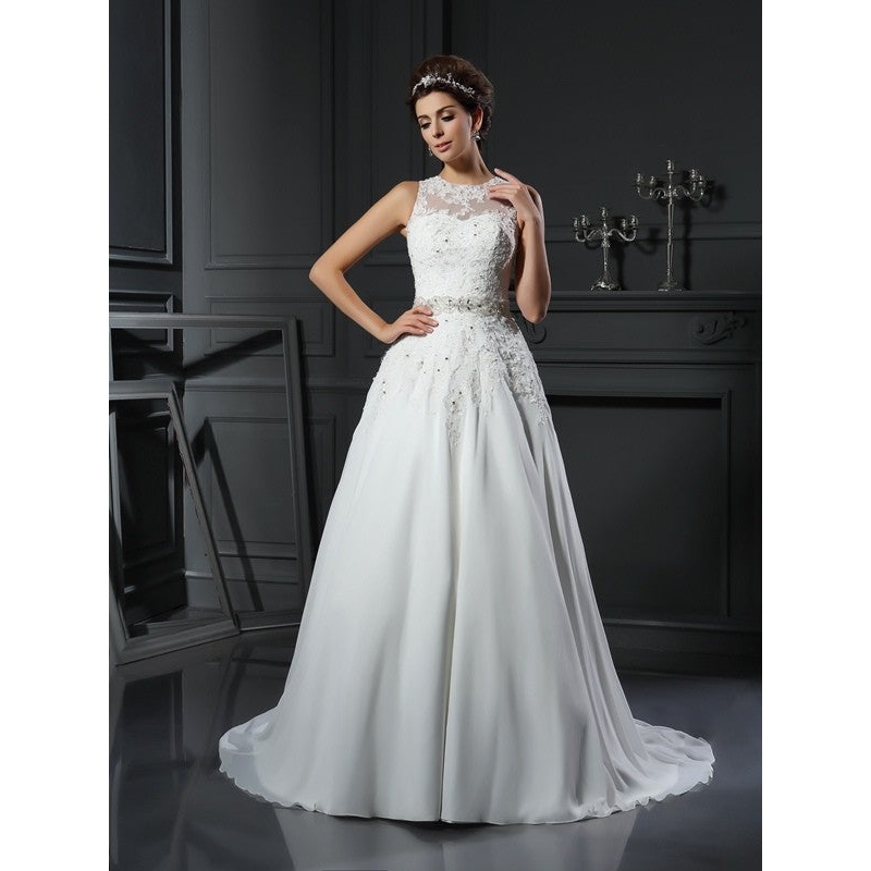 A-Line/Princess High Neck Beading Sleeveless Long Chiffon Wedding Dresses
