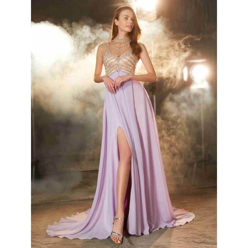 A-Line/Princess High Neck Sleeveless Sweep/Brush Train Crystal Chiffon Dresses