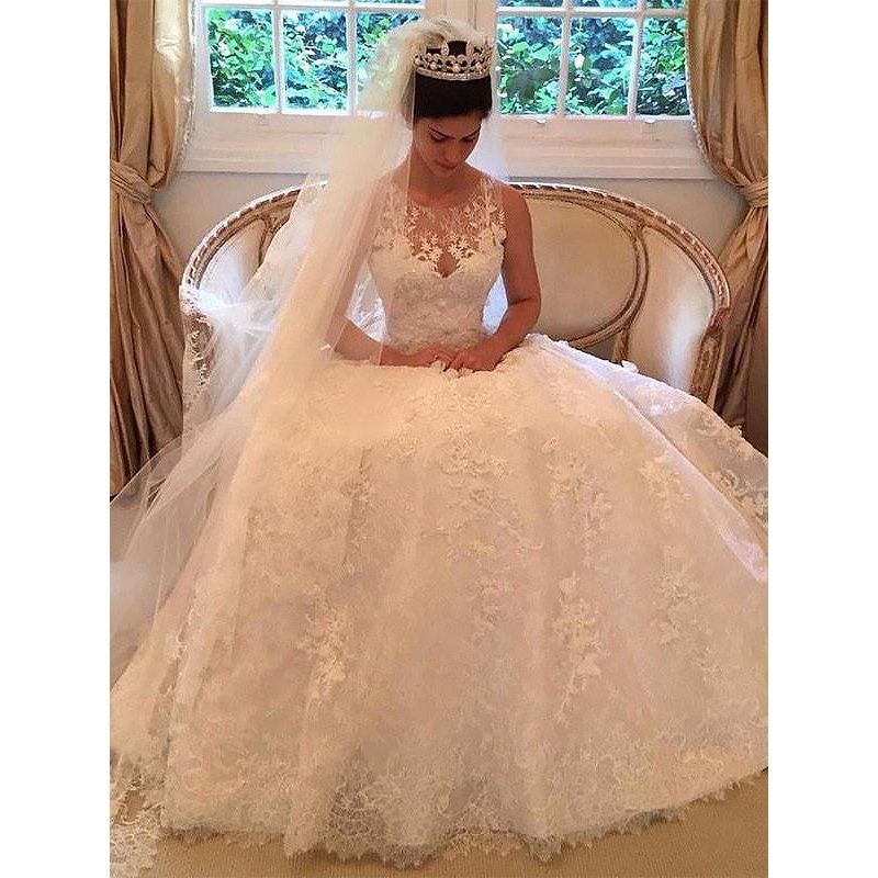 A-Line/Princess Lace Court Train Scoop Applique Sleeveless Wedding Dresses