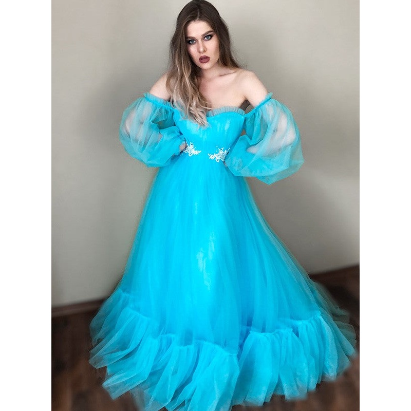 A-Line/Princess Off-the-Shoulder Applique Tulle Floor-Length Long Sleeves Dresses