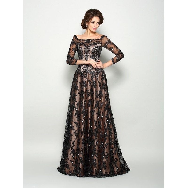 A-Line/Princess Off-the-Shoulder Lace 3/4 Sleeves Long Satin Mother of the Bride Dresses