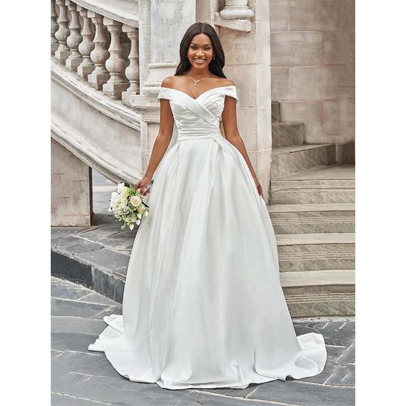 Be the first to review “A-Line/Princess Off-the-Shoulder Ruched Sleeveless Satin Court Train Wedding Dresses”